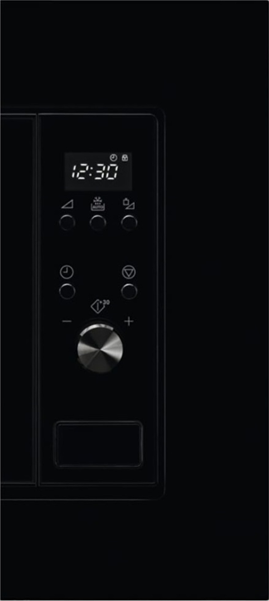 Встраиваемая микроволновая печь Electrolux LMS2203EMK — сочетание стильного дизайна и отличной функциональности. Комбинация блестящих черных поверхностей и стали выглядит строго и лаконично. Специальное покрытие Antifingerprint избавляет модель от отпечатков пальцев — ничто не испортит внешний вид изделия. Прибор отличается довольно компактными размерами: при ширине 59,5 см высота и глубина составляют 38,8 и 34,7 см соответственно. Для встраивания понадобится ниша размером 38×56×35 см, при этом на выбранный элемент меблировки придется нагрузка 12,5 кг. Объема внутренней камеры 20 л хватит для разогрева и приготовления всевозможных блюд.