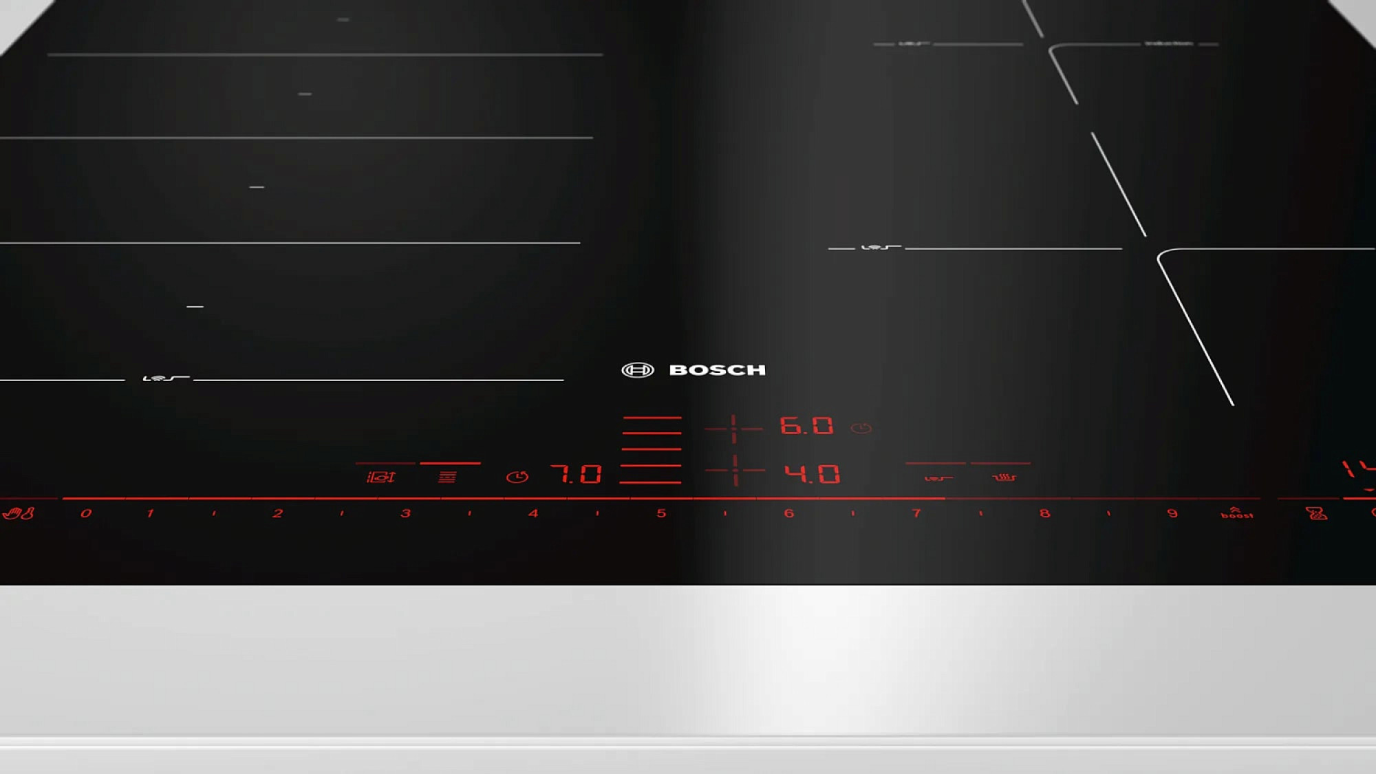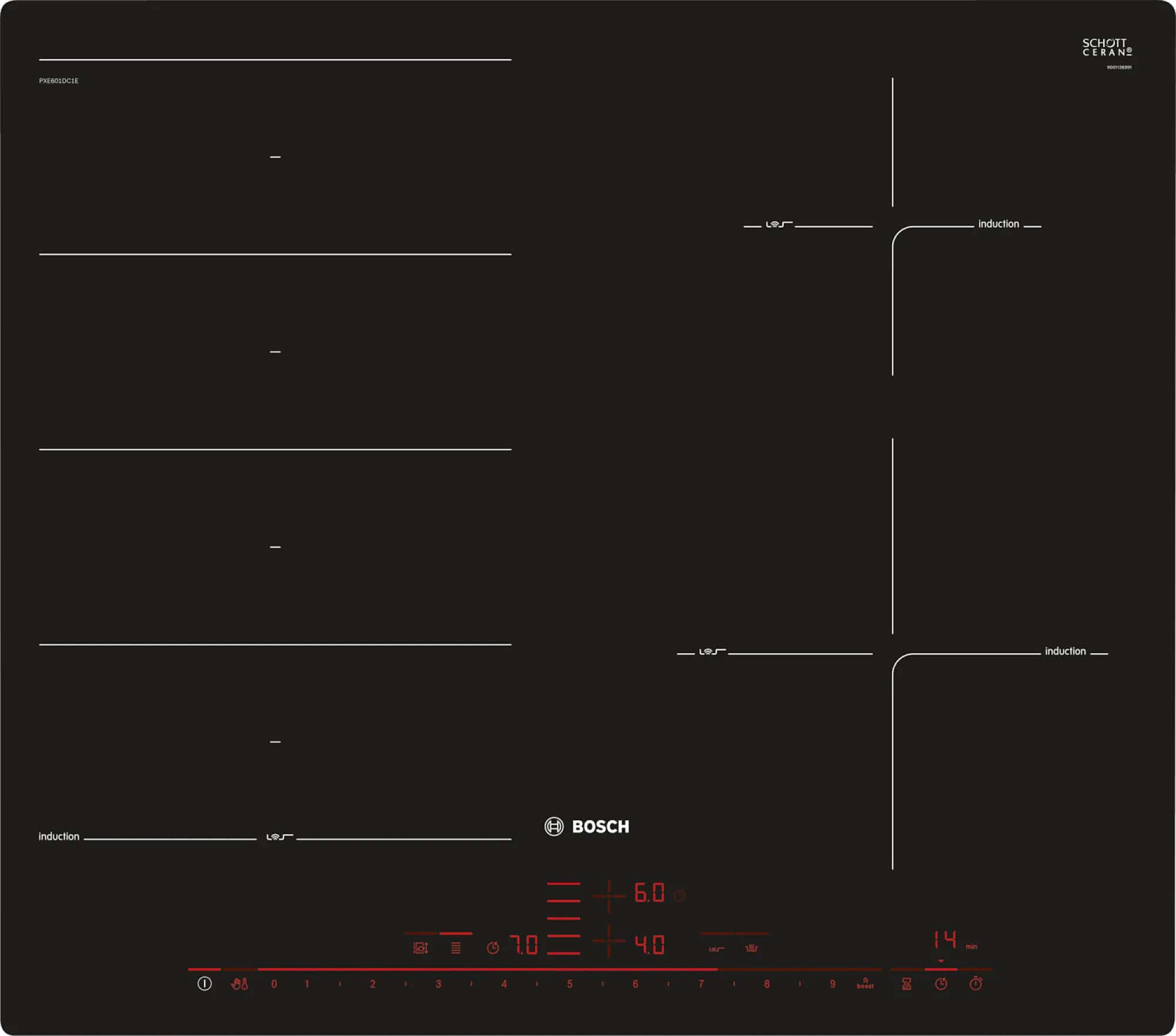 Варочная поверхность Bosch PXE601DC1E шириной 60 сантиметров оснащена сенсором PerfectFry с пятью температурными диапазонами. Четыре индукционные зоны нагрева и одна FlexInduction под высококачественной стеклокерамикой SCHOTT CERAN. Панель управления DirectSelect Premium длиной 30 сантиметров позволяет выбрать функцию и уровня нагрева простым касанием пальца. При активации режима MoveMode зона FlexZone делится на три сегмента с предустановленными уровнями 9, 5 и 1.