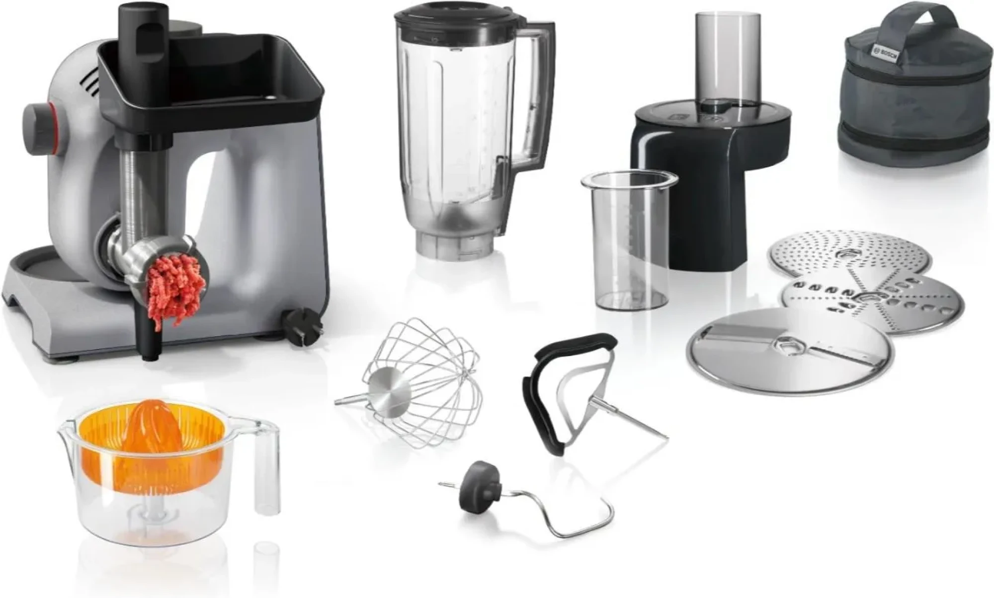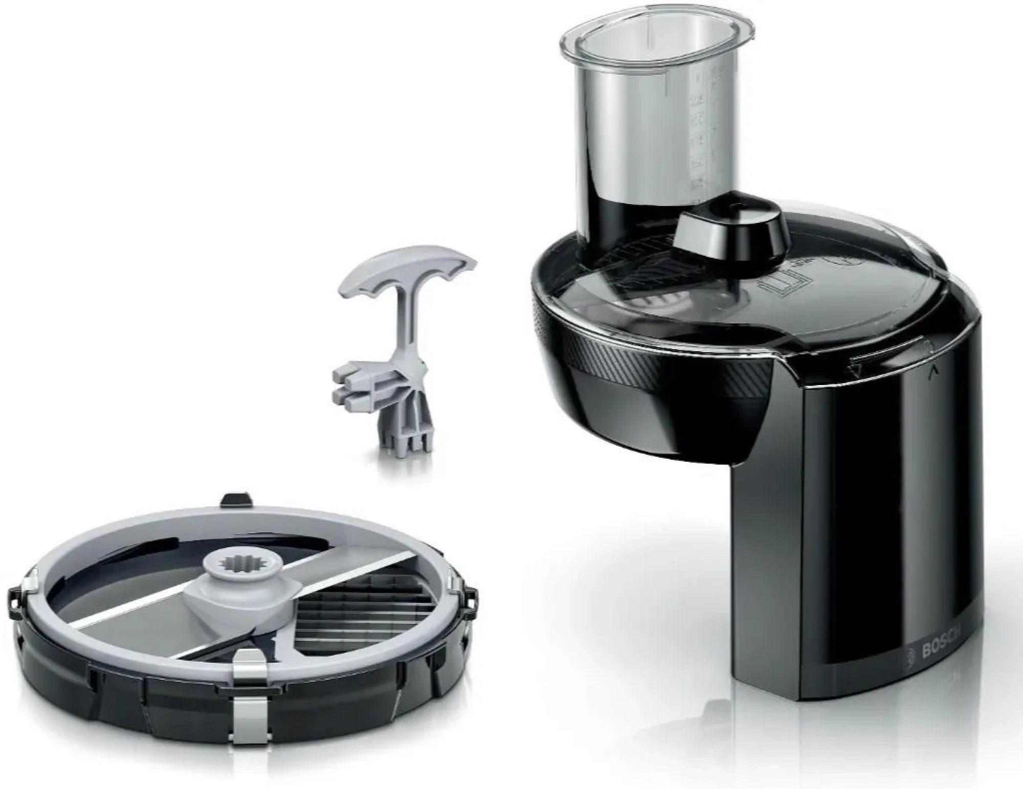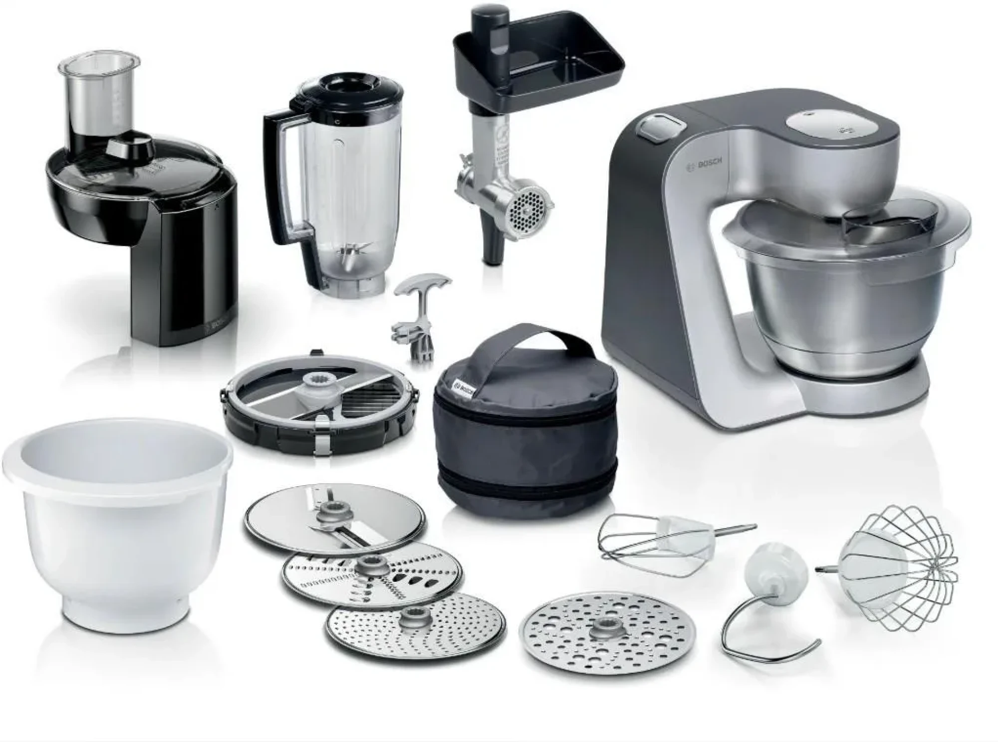 Многофункциональный кухонный комбайн MUM 4 предлагает 1000 ватт мощности и 7-ступенчатое управление скоростью, обеспечивая полный контроль. Эта модель отличается богатым оборудованием — в комплекте входит кубический резак, дополнительная чаша, 4 диска (в том числе для натирания картофеля), а также мясорубка и блендер. Благодаря этому вы легко готовите как сладкую выпечку, так и солёные блюда, либо полезные коктейли.