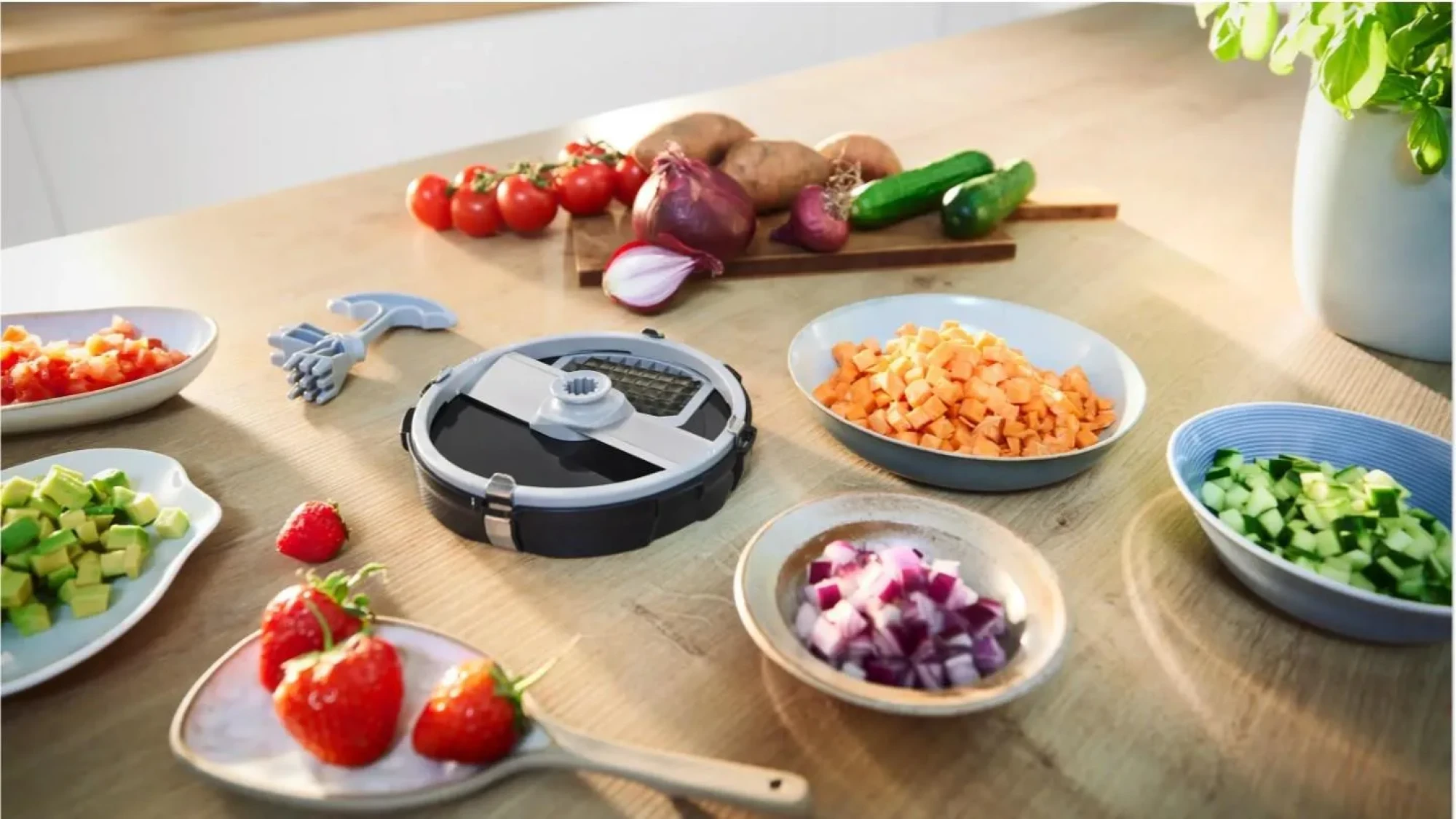 Очень универсально — быстро и легко измельчать, терть и нарезать различные ингредиенты прямо в миску. Диски из нержавеющей стали обеспечивают естественный вкус приготовленной пищи и легко чистятся. Рубка для фруктов и овощей с четырьмя взаимозаменяемыми дисками из нержавеющей стали (6 функций): диск для тонкого трения, двусторонний диск для нарезки (грубого и мелкого), двусторонний диск для нарезания стружки (крупных и мелких частиц), Диск для тёрки для картофеля для блинчиков.