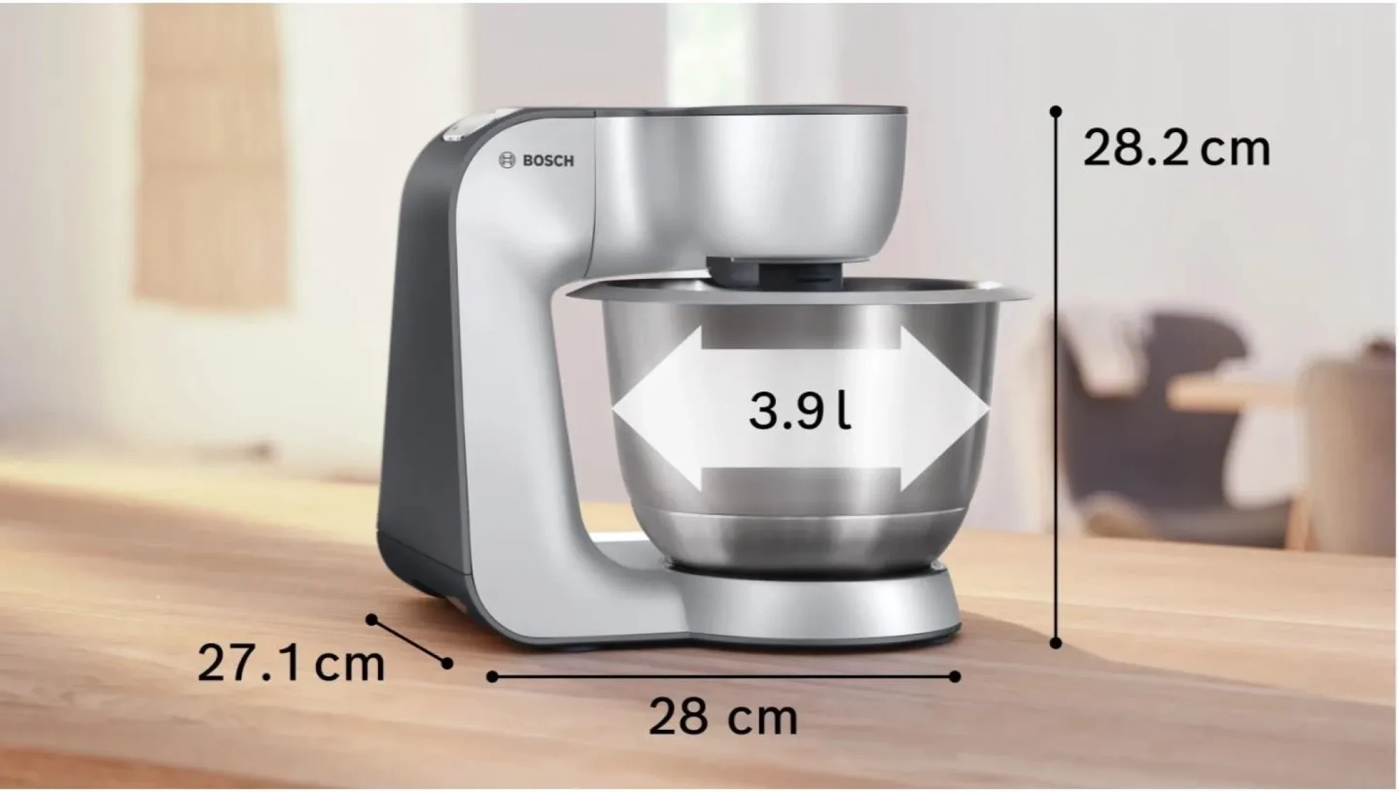 Для достижения наилучшего результата в виде хорошо замешенного теста форма чаши и мешалки в кухонных комбайнах Bosch была адаптирована так, чтобы они максимально хорошо работали вместе. Высококачественная миска из нержавеющей стали ёмкостью 3,9 л хорошо подойдёт как для мелких, так и больших порций ингредиентов. Он позволяет удобно готовить лёгкое тесто до 2,7 кг и тяжелее, например, хлеб весом до 1,9 кг, обеспечивая комфорт и универсальность в повседневном использовании.Набор практичных насадок