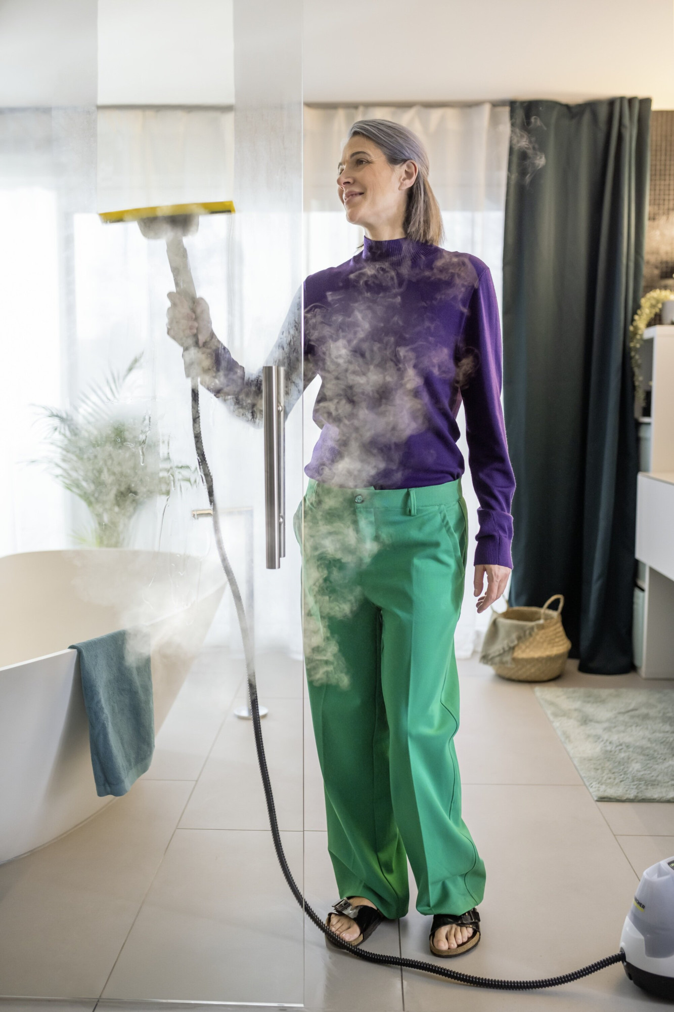 Karcher SC 3 EasyFix укомплектован круглой насадкой в виде щетки для очистки плитки, вытяжки, варочной панели и других поверхностей со стойкими загрязнениями. Для пола можно дополнительно использовать насадку-щетку. Пар выходит из сопла со скоростью 40 г/мин. Настройка этого параметра осуществляется при помощи 2-ступенчатого регулятора. Пароочиститель обладает мощностью 1900 Вт, что позволяет ему за 30 секунд нагревать воду в баке.