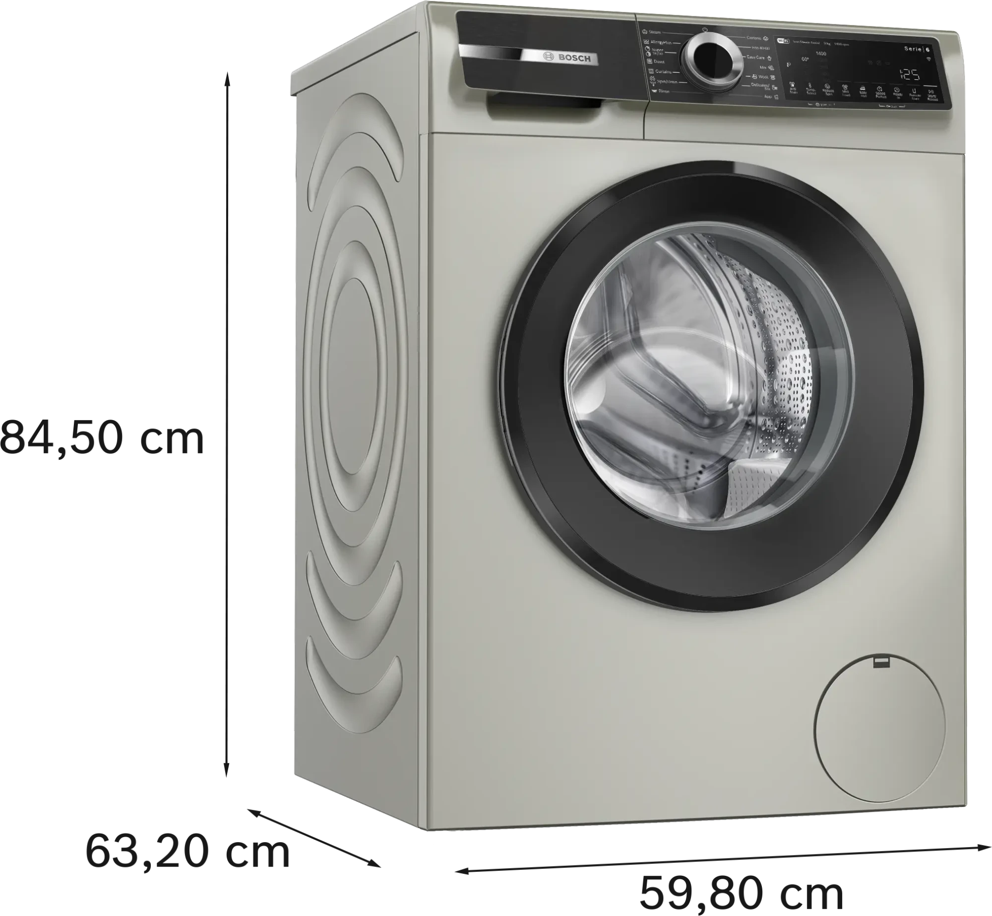 Стиральная машина Bosch WGK244ZXME имеет элегантный серебристый корпус он сочетает минималистичную эстетику с практичностью: лаконичные линии, компактные габариты (высота 84.5 см, ширина 59.8 см, глубина 59 см) и продуманная фронтальная загрузка делают прибор универсальным решением для современного интерьера. При глубине с открытой дверцей 104.9 см загрузочный люк удобен для закладки и выгрузки громоздких предметов, а вместимость до 9 килограммов позволяет обрабатывать крупные партии белья за цикл, сохраняя баланс между объёмом и качеством ухода.