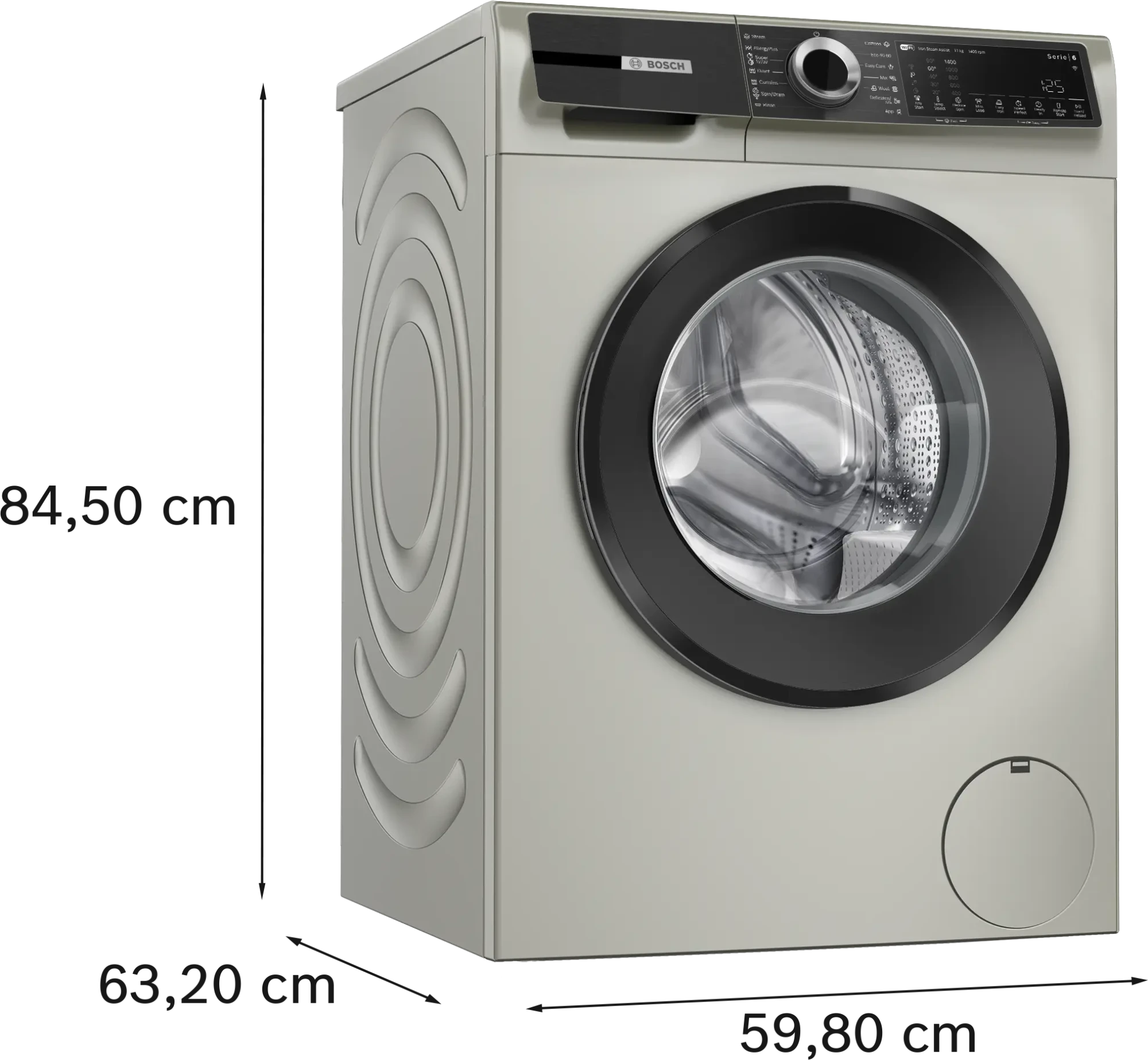 Эта модель серии Serie 6 воплощает сбалансированную гармонию внешнего вида, эргономики и функционала. Серебристый корпус аккуратно вписывается в любой интерьер, а продуманная фронтальная загрузка делает эксплуатацию удобной даже в компактных помещениях. Высота 84.5 см и ширина 59.8 см соответствуют стандартным нишам, при этом глубина 59 см сохраняет оптимальный запас пространства; при открытой дверце габарит увеличивается до 104.9 см, что важно учитывать при размещении. Дизайн учитывает устойчивость и тишину: конструкция AntiVibration снижает вибрации, а инверторный мотор EcoSilenceDrive обеспечивает плавную работу с минимальным уровнем шума — всего 51 дБ при стирке и 73 дБ при отжиме.