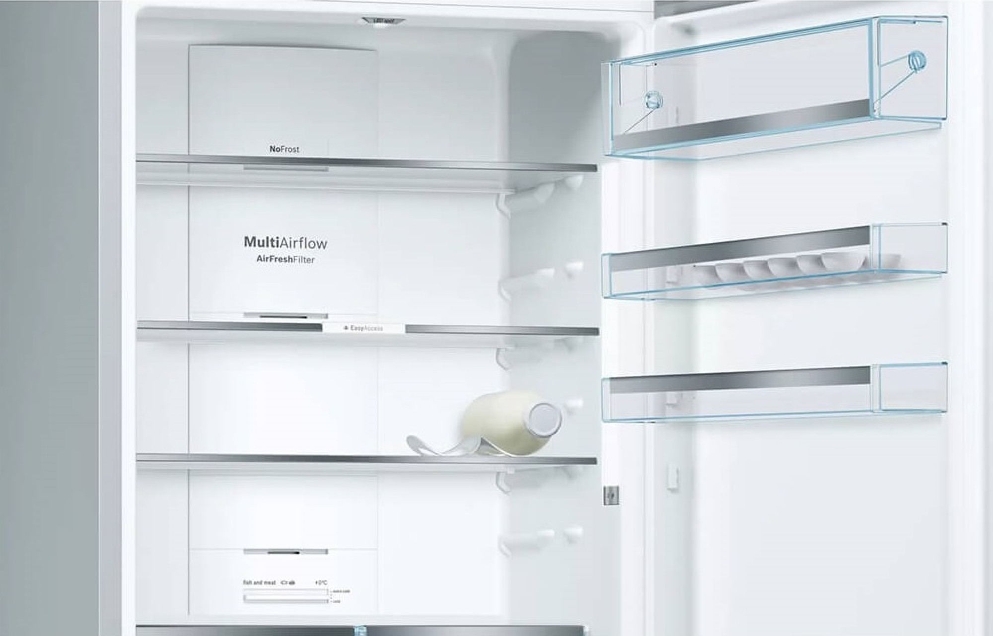 Организация пространства продумана: внутри пять стеклянных полок (четыре регулируемые и одна фиксированная), выдвижные полки EasyAccess и светодиодная подсветка. На двери — четыре полки, в серийной комплектации полка для бутылок и три подставки для яиц. В зоне свежести VitaFresh plus три контейнера — удобно разделять мясо, молочные продукты и овощи. Система VarioZone позволяет легко переставлять элементы под текущие задачи. В морозильном отделении — три выдвижных ящика и лоток для кубиков льда.