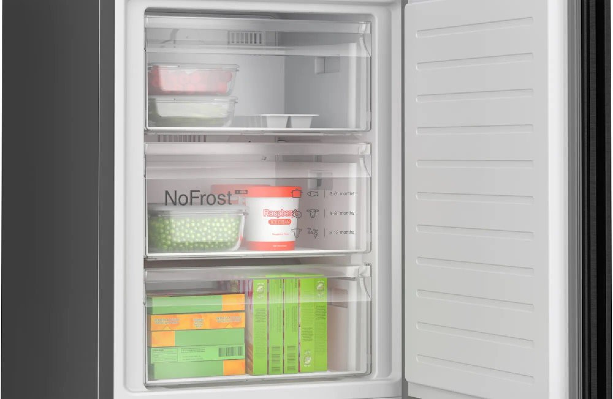 - Оснащение: 4 стеклянные полки, 1 полка для бутылок, 4 дверные полки, 1 ящик для мяса и рыбы, контейнер для яиц, 1 ящик для овощей и фруктов